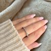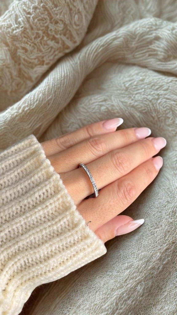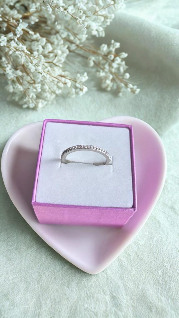 Un diseño sutil y sofisticado que realza la belleza de lo simple. Este anillo presenta una fina banda adornada con pequeños cristales que capturan la luz con cada movimiento, aportando un brillo delicado y femenino.