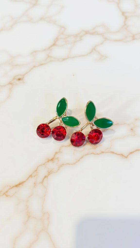 Dale un toque de frescura y color a tu look con estos encantadores aros inspirados en la naturaleza. Su diseño en forma de cerezas en tendencia, combina piedras rojas brillantes con delicadas hojas verdes, creando una pieza vibrante y femenina.
