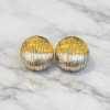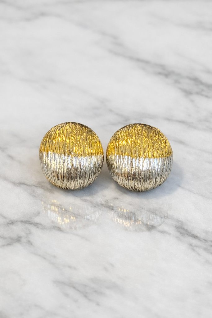 Estos aros de forma esférica combinan con maestría dos tonos metálicos: oro y plata. La superficie texturada, con delicadas líneas verticales, aporta profundidad y un brillo sutil que se realza bajo la luz. El acabado dorado en la parte superior se funde armoniosamente con el plateado inferior, creando una pieza versátil y elegante.