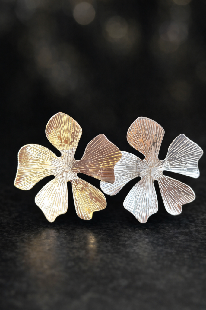 Estos aros en forma de flor de cinco pétalos capturan la esencia de la elegancia orgánica. Cada pétalo está finamente texturado con líneas radiantes que convergen en el centro, creando un juego de luces sutil y sofisticado. La combinación de tonos dorados y plateados aporta versatilidad y distinción, ideal para quienes buscan piezas únicas con carácter.